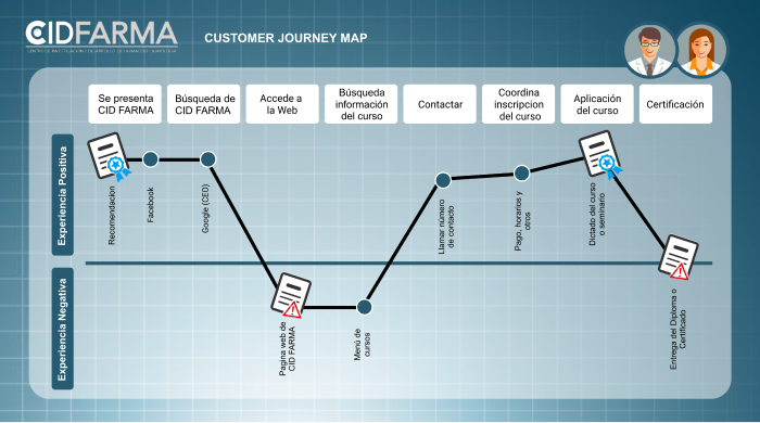 En conclusión, tenemos actualmente tres puntos de contacto que debemos mejorar, la mayoría relacionados a la presentación de los servicios vía página web. Los momentos como las recomendaciones, la búsqueda en Google, el contactar y coordinar inscripción y la aplicación del curso logran dar al usuario una experiencia positiva. En este sentido, los puntos de contacto más resaltantes son "las recomendaciones" y "el dictado del curso y seminario", pues realmente cumplen con que el usuario o usuaria espera.